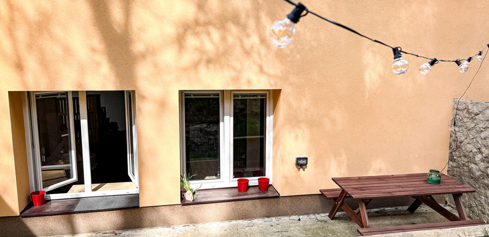 Na přilehlou zahrádku se vchází po schodech oknem. Zahrádka je soukromá, a velmi klidná.